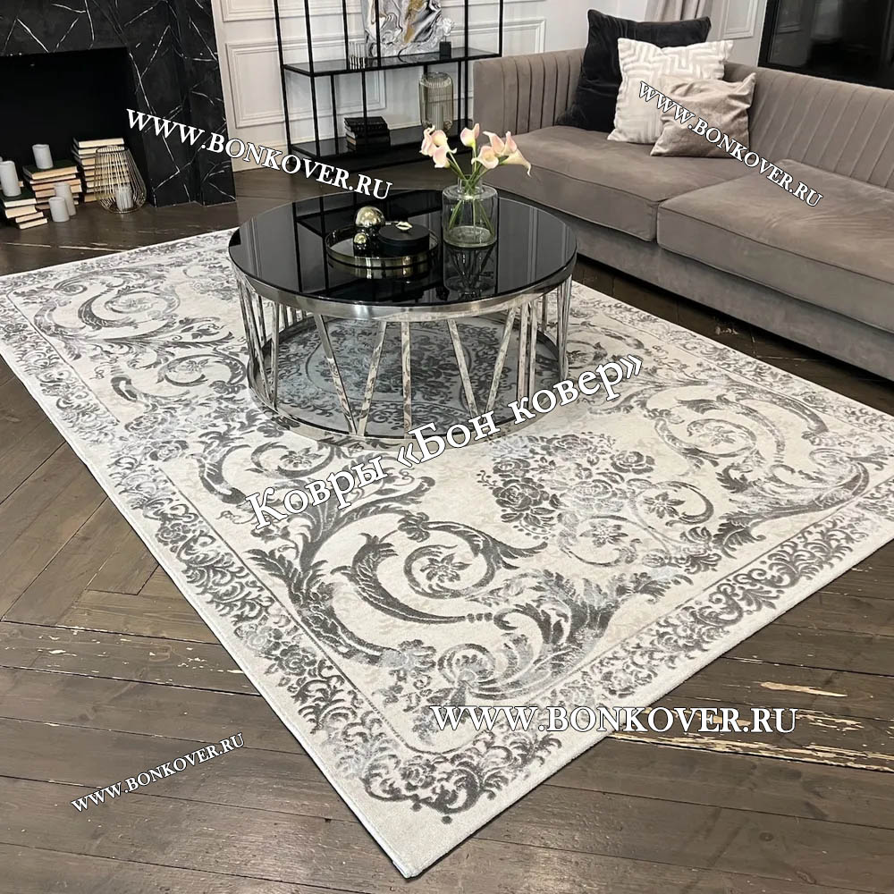 Изящный Ковер в гостиную дизайн 12 Серый наполняет интерьер квартиры теплом и уютом, гармонично сочетает в себе изящество и красоту. Он изготовлен из износостойких материалов, прочный и долговечный.