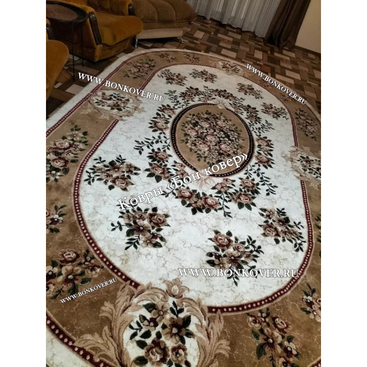 Элегантный Ковер в гостиную дизайн 143 Бежевый наполняет интерьер помещения теплом и уютом, гармонично сочетает в себе изящество и красоту. Он соткан из износостойких материалов, прочный и долговечный.
